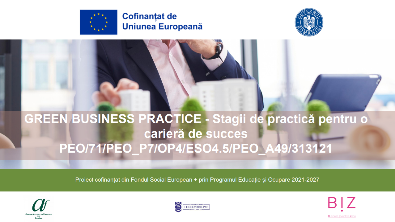 În perioada 01 ianuarie 2025 -31 decembrie 2026, în parteneriat cu Universitatea 1 Decembrie 2018 din Alba-Iulia și Business Inventive Zone, CAFR, în calitate de Lider, derulează proiectul GREEN BUSINESS PRACTICE, al cărui obiectiv general este furnizarea unei oferte educaționale axată pe dezvoltarea competențelor profesionale şi transversale cerute pe piața muncii, prin sprijinirea a 260 de studenți din domeniile ştiințe economice și drept, pe o perioadă de 24 de luni, în tranziția de la educație